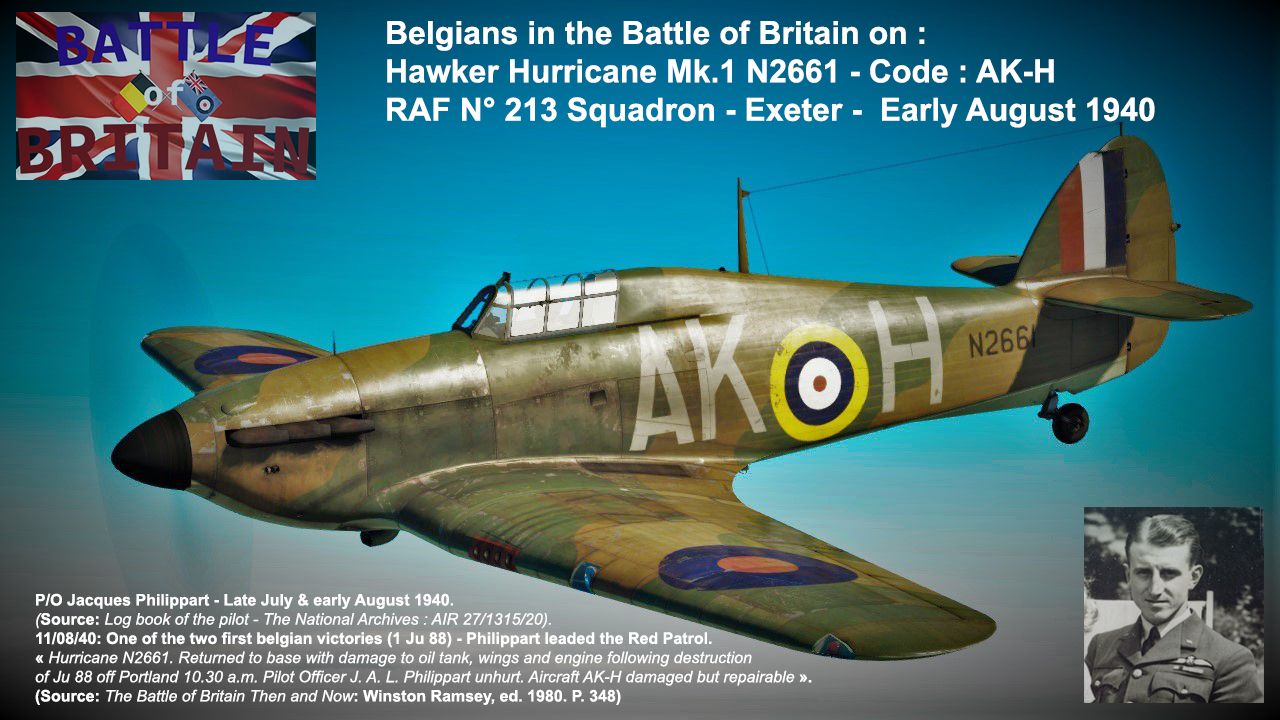 Hurricane N2661 returned to RAF Exeter with damage to the oil tank, wings and engine following a combat with a Ju 88 off Portland. Pilot Officer J. A. L. Philippart was uninjured but the aircraft was damaged and repaired.