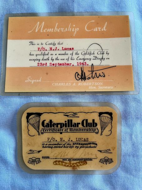 Below - Airmen who successfully bail out of their aircraft and ditch in the sea become members of two clubs that are still going today. The Caterpillar Club is an informal association of people who have successfully used a parachute to bail out of a disabled aircraft. After authentication by the parachute maker, applicants receive a membership certificate and a distinctive lapel pin.