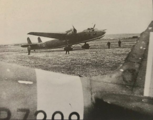 Below - On 26 June 1943 all personnel boarded No. 271 Squadron transports and were flown from Exeter to Castletown, Scotland. Here a Handley Page Harrow, coded BJ-E, can be seen over the tail of Spitfire Mk. 5b R7298 NX-Q, still in No. 131 Squadron markings. Later the 'X' was over-painted with an 'N'.