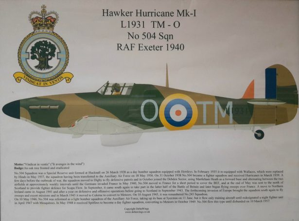 No. 504 Squadron were equipped with the Hurricane Mk1 until July 1941 when they upgraded to the Hurricane MkIIb until November 1941. From October 1941 the Squadron was equipped with the Spitfire MkIIa and MkIIb until February 1942. From then until the end of the war the Squadron had many variants of Spitfire with the MkVb, MkVc, MkVI, MkIXb, MkVb and the MkIXe.
