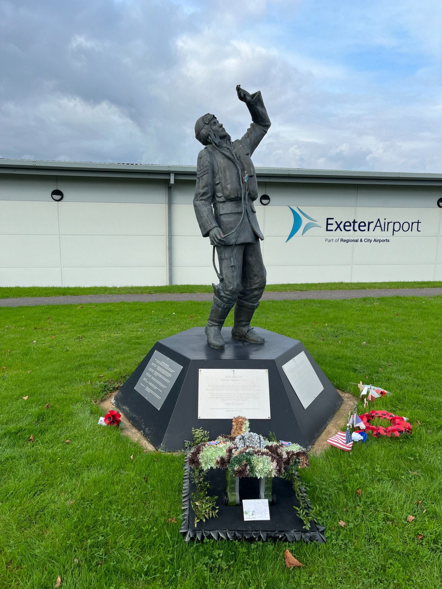 This bronze airman welcomes staff and passengers at the entrance to Exeter Airport, Exeter, Devon, United Kingdom. Robin Gilbert & Frances Margaret.