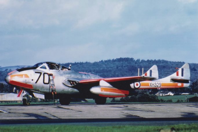 Following the disbandment of the Royal Auxiliary Air Force on 10 March 1957, additional Vampire FB.5s arrived at Exeter, later replaced by Vampire T.11s. The 1960s saw further diversification with Hawker Hunter F.4s and Jet Provosts joining the fleet.