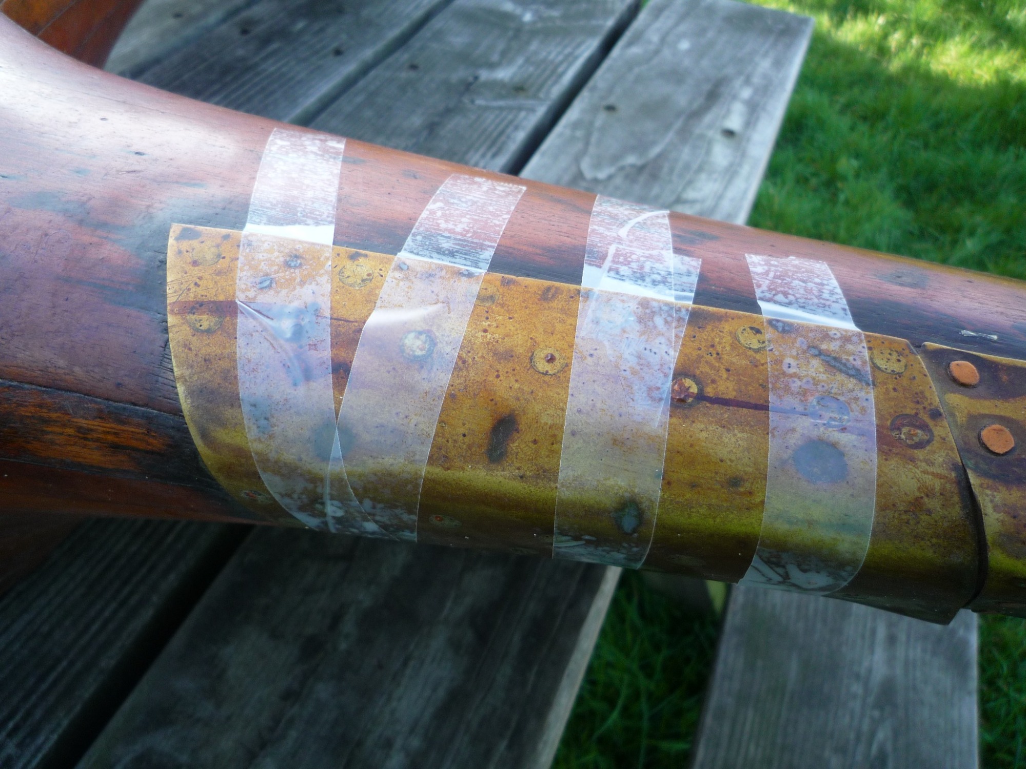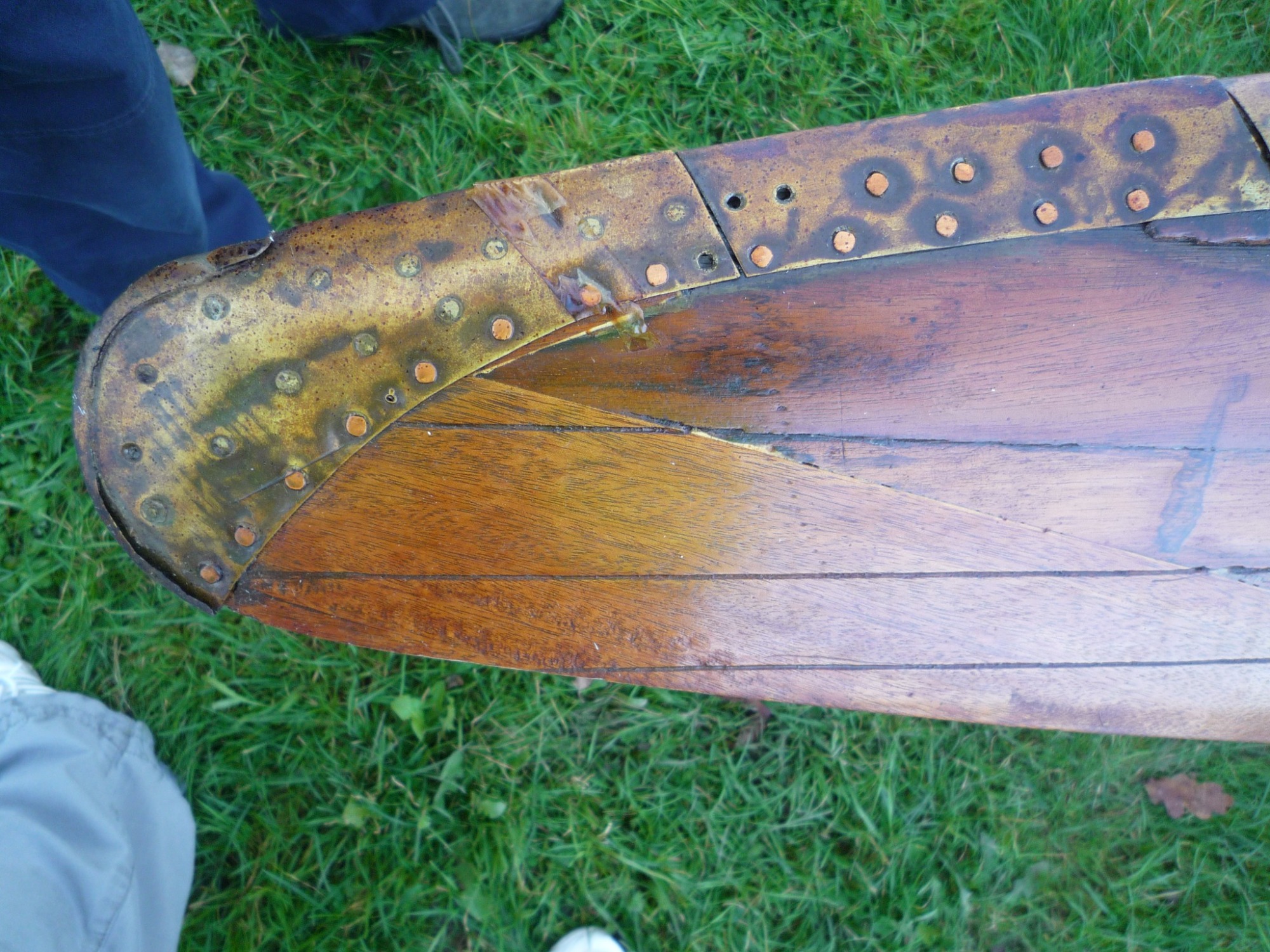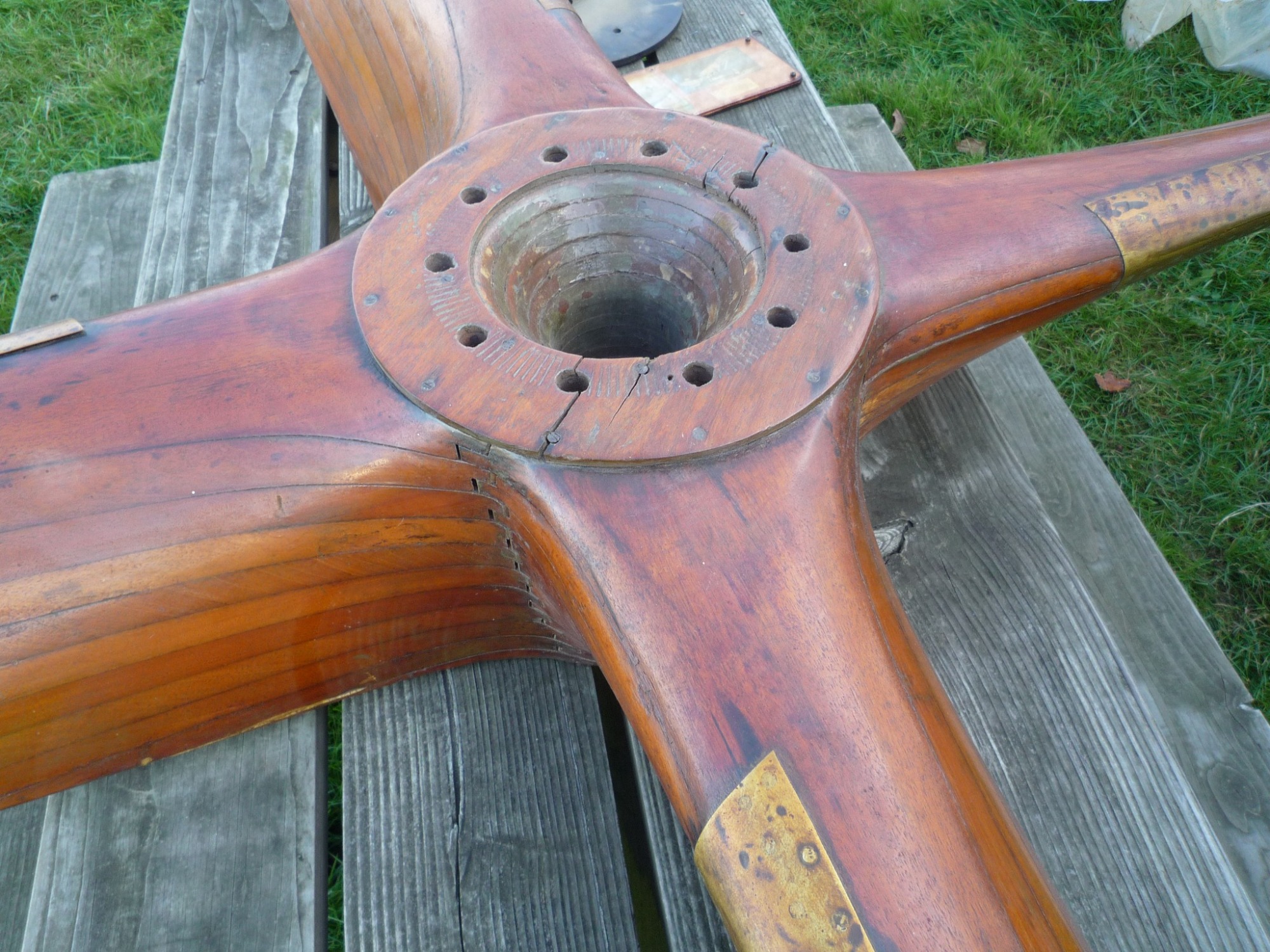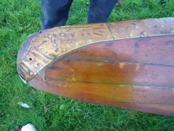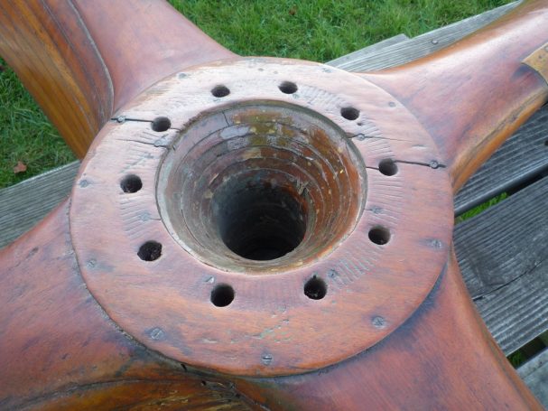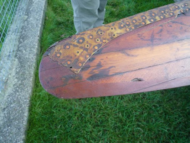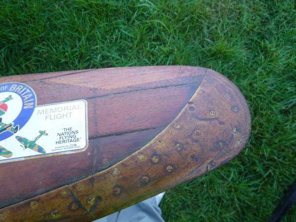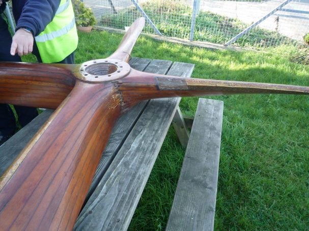 The four-bladed wooden propeller was recovered from it by somebody local and spent many years holding up a cloche (a frame and plastic cover structure put over plants to encourage growth), then Mike Revill came across it, and acquired it for the Exeter Flying Club. It was installed onto the ceiling in the EFC clubhouse adjacent to the bar and reception area. When it was on the ceiling it had a small plaque with information of the unfortunate event.