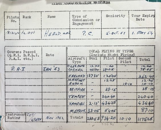 By 1949, Rufus Heald had entered the jet age, flying Gloster Meteors — a significant leap from his wartime piston-engine aircraft. He also flew Martinets for target towing duties, which he described as “a little different,” reflecting the varied demands of post-war RAF service.