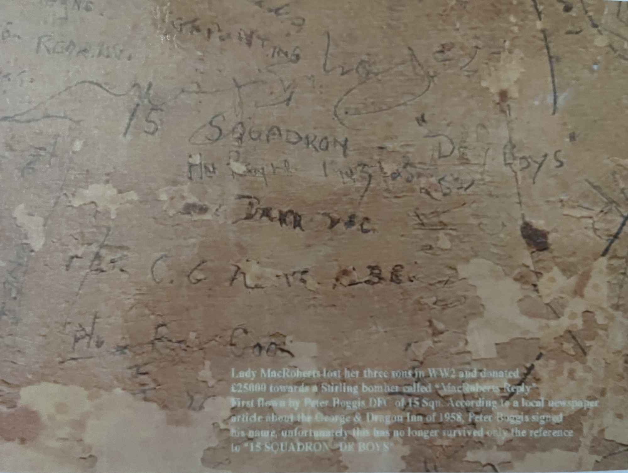 The only surviving reference to the pilots of 15 Squadron. They had signed the ceiling but sadly the signatures were amongst those destroyed. The only reference is simply '15 Squadron De Boys'. Photo Suzannah Holwell.