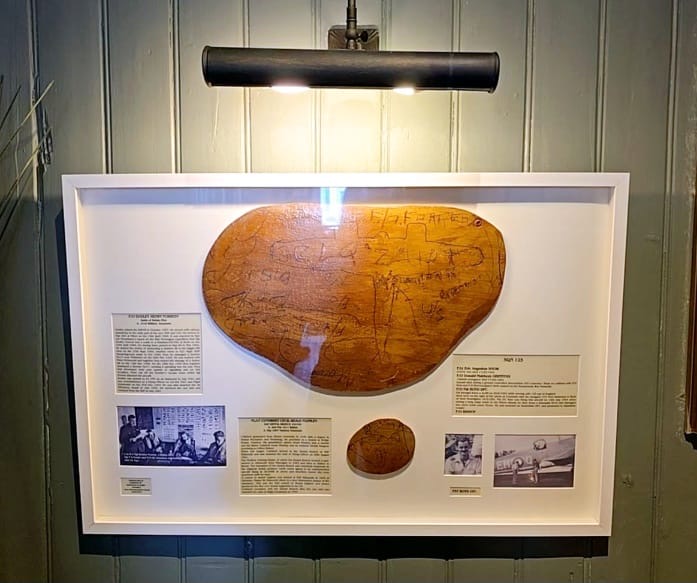 Once the project was completed and the frames duly ready to be displayed the couple offered them to the Royal Albert Memorial Museum (RAAM), Exeter. When RAAM inspected the framed panels, it was discovered that the varnish used to protect them was doing more harm than good and that eventually they would disintegrate. Regrettably the RAAM had to turn down the kind offer as it was believed they would not last long. The same story was the case when the 307 Squadron Project were offered the framed signatures. I have since discovered that there are five small sections of a panel mounted in glass frames in the Topsham museum as part of a Second World War exhibition room. This exhibition has now ended and the frames have been recovered back to the couple in Clyst St George.