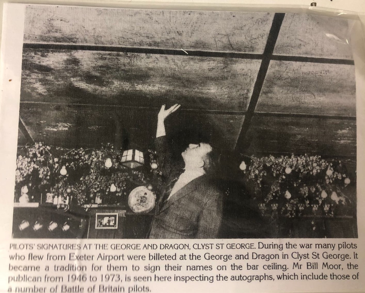 The George and Dragon hotel and restaurant at Clyst St George, was a place of wartime history with airmen from nearby RAF Exeter billeted there during the 1940s and 1950s. Personnel including Americans, Canadians, Polish, Czech, Australians and Burmese signed their names on the ceiling tiles when they were staying there.