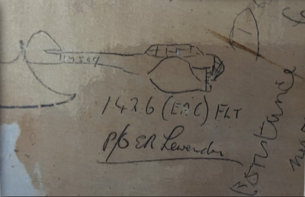 Pilot Officer E R Lewendon of 1426 (ERC) Flight clearly signed this ceiling tile. Photo Suzannah Holwell.