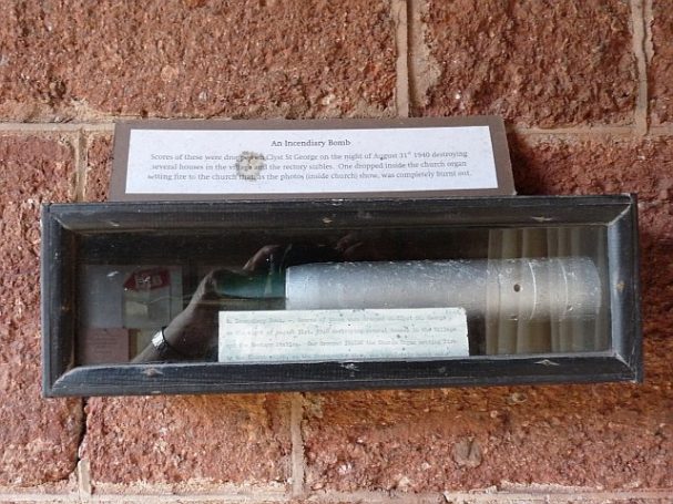 Below is one incendiary device that is displayed in the doorway of the church at Clyst St George. Scores of these were dropped on Clyst St George on the night of August 31st 1940 destroying several houses in the village and the rectory stables. One dropped inside the church organ setting fire to the church. Photo credited to the original copyright owner.