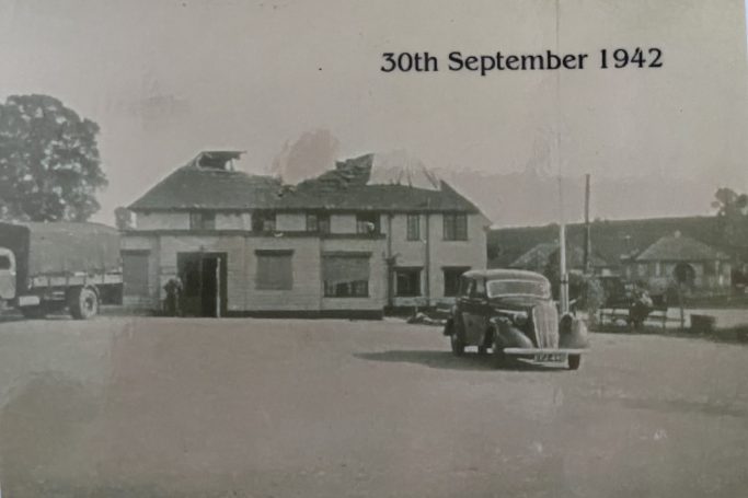 A photograph clearly showing the damage to the pub roof following the unfortunate accident from a very low flypast of an Exeter based Hurricane fighter. Sadly the pilot perished and the aircraft was written off. Photo Suzannah Holwell.