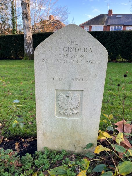 Jan Piotr Gindera suffered an unfortunate accident when responding to a Squadron Scramble from RAF Exeter. He was cycling back to dispersal when he got struck by a service vehicle on the airfield and was killed on the 20 April 1942. This was recorded in the Operational Record Book for the days activities and Gindera is buried in the Higher Cemetery, Heavitree, Exeter, Devon.