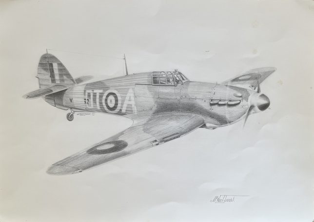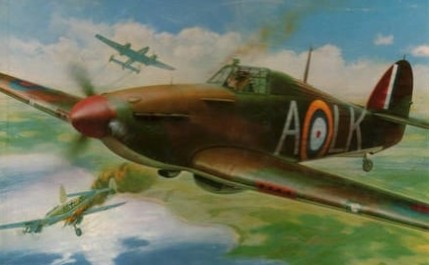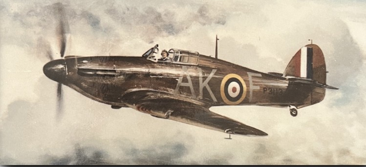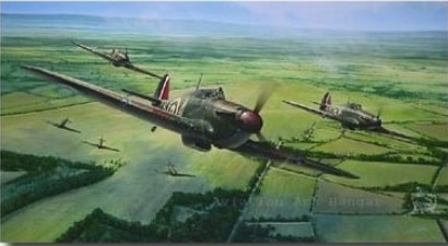 Below - A painting by artist Geoffrey Nutkins of a 213 Squadron Hurricane flown by Sgt M E Croskell over Southern England in the Summer of 1940.
