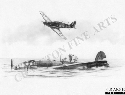 In the early evening of the 18th of July 1941, following coastguard reports of an enemy aircraft in their vicinity, two Hurricanes of 87 Sqn on detachment at the Airfield at St Mary's, Scilly Isles were scrambled to an area some 30 miles south west of the Scilly Isles where they intercepted a lone Heinkel He111. Alex Thom was the first to attack, his windscreen being sprayed with oil as his rounds tore into the Heinkel's starboard engine. Breaking away, his wingman F/O Roscoe now took over the chase, but the German bomber was already mortally wounded and was observed to alight onto the sea where upon the crew immediately took to their life raft as the Heinkel began to sink beneath the waves just minutes later, Thom circled overhead until he saw the motor launch arrive to pick up the German aircrew before returning back to St Mary's.