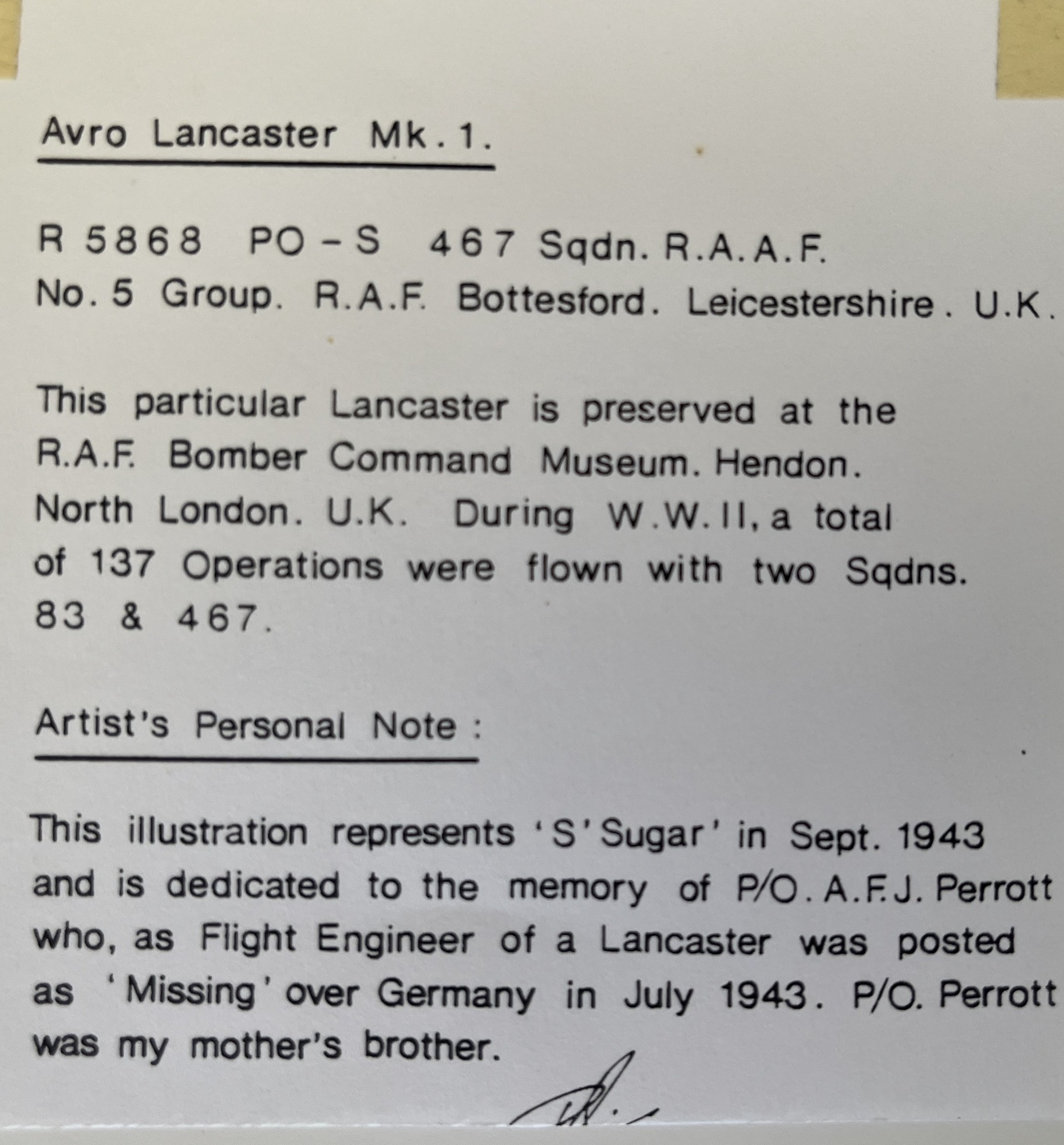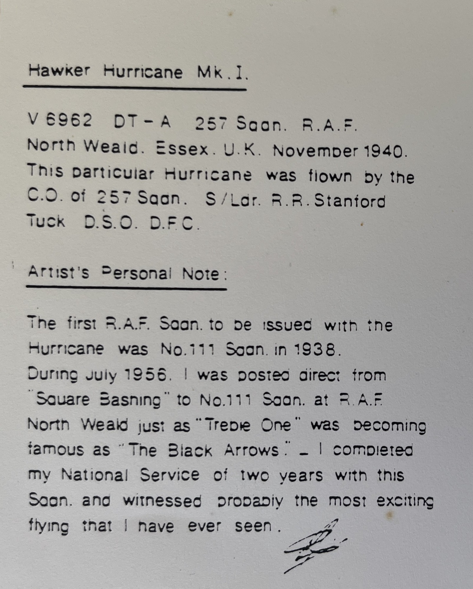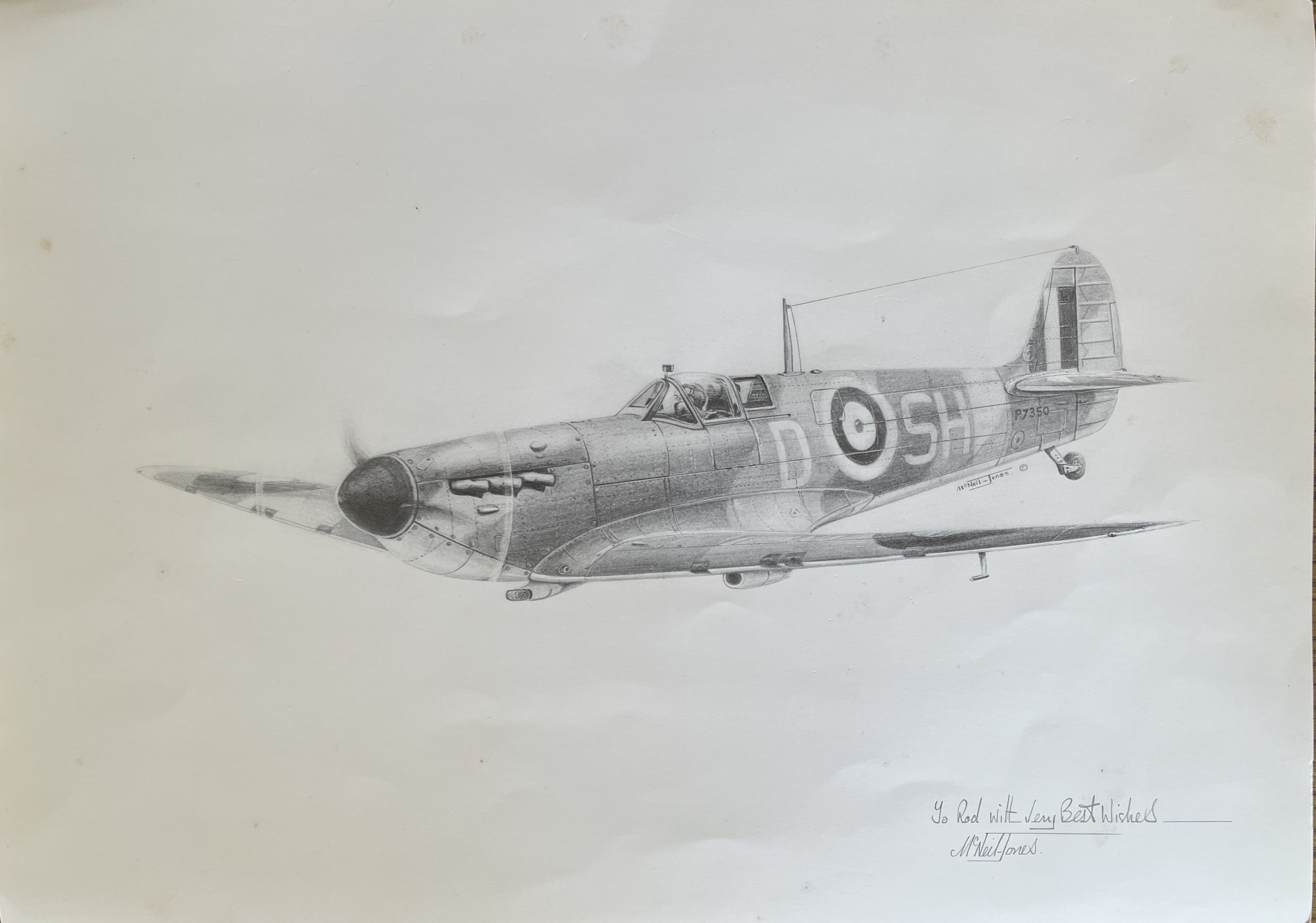 The four remarkable sketches below were the talented work of Peter McNeil-Jones from Essex. All are signed and personalised to my good friend Rodney Moffatt from Uffculme, Devon. Rod' visited our Battle of Britain exhibition on Sunday 6 July 2025 at Exeter Airport terminal building and kindly offered them to us. Each of the four sketches had notes on the reverse which have been included on here also.