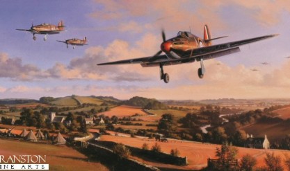 Below - Vital Force by Richard Taylor depicts Hawker Hurricanes departing from RAF Exeter flying low over the Devon countryside. Photo courtesy of Aviation Art Hangar.