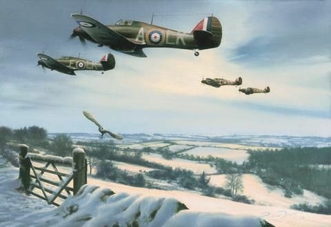 Below - WINTER COMBAT – THE PAINTING by Richard Taylor. The Battle of Britain may be over but the first snows of winter hint at the bitter fighting that still lies ahead as Squadron Leader Ian Gleed and the Mk.I Hurricanes of 87 Squadron head home to RAF Exeter.