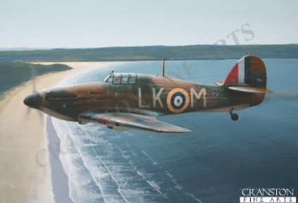 Hurricane LK-M of No.87 Squadron piloted by Flt Lt Alex Thom DFC limps over the south coast of England on 19th August 1942. While supporting troops on the ground at Dieppe, the Hurricane was hit by ground fire and lost oil pressure. Alex Thom got the damaged aircraft back to Britain, making a forced landing at East Den. Ferried back to 87 Sqns airfield, he immediately set off once more for Dieppe in Hurricane LK-A.