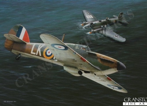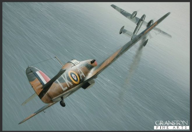 Flight Lieutenant Ian Widge Gleed is depicted in his personal Hurricane 1 P2798 (LK-A) of 87 Sqn shooting down a Messerschmitt Bf.110 on 15th August 1940. Just visible beneath the cockpit of the Hurricane is his mascot, Figaro, shown kicking a swastika. His aircraft was also easily identifiable by the red flash on its nose, a feature that was retained even when P2798 was painted all black for its night fighter role. Gleed scored many victories before being shot down and killed whilst flying a Spitfire Vc in the Western Desert in April 1943. Photo courtesy of Cranston Fine Arts.