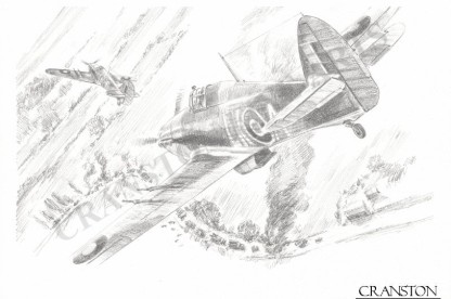 Below - Ian Gleed 87 Squadron in some heavy action in his Hurricane MK1. Photo courtesy of Aviation Art.