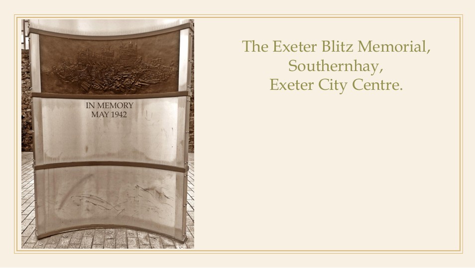 The evening of May 4th she had travelled by bus with her mother to visit an Aunt & Uncle on a farm near Ottery St Mary. In the night she woke to see her mother and another lady crying. She remembers watching the orange glow in the sky which they knew was Exeter burning.